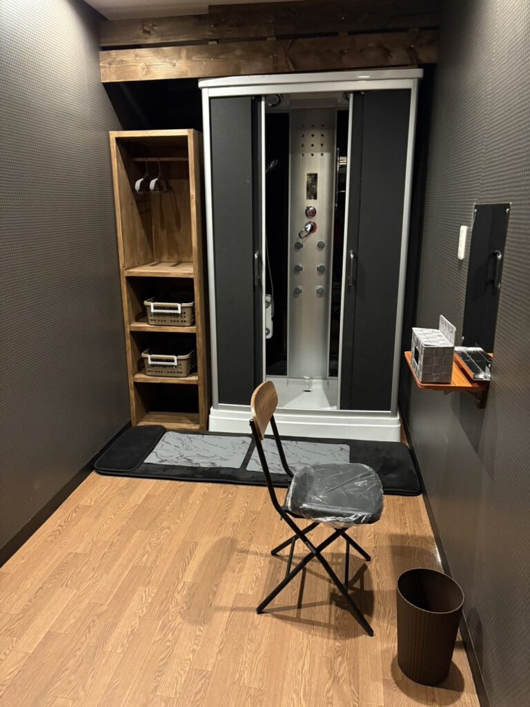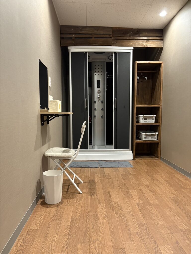 男性用と女性用のシャワールームがあり、100v電源もあるのでドライヤーやコテも持込可能!